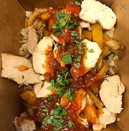Perfectly grilled chicken, peppers and onions in a chili-lime infused salsa gravy over cilantro-lime, coconut milk, cauliflower rice... Next destination: Drool-ville!!